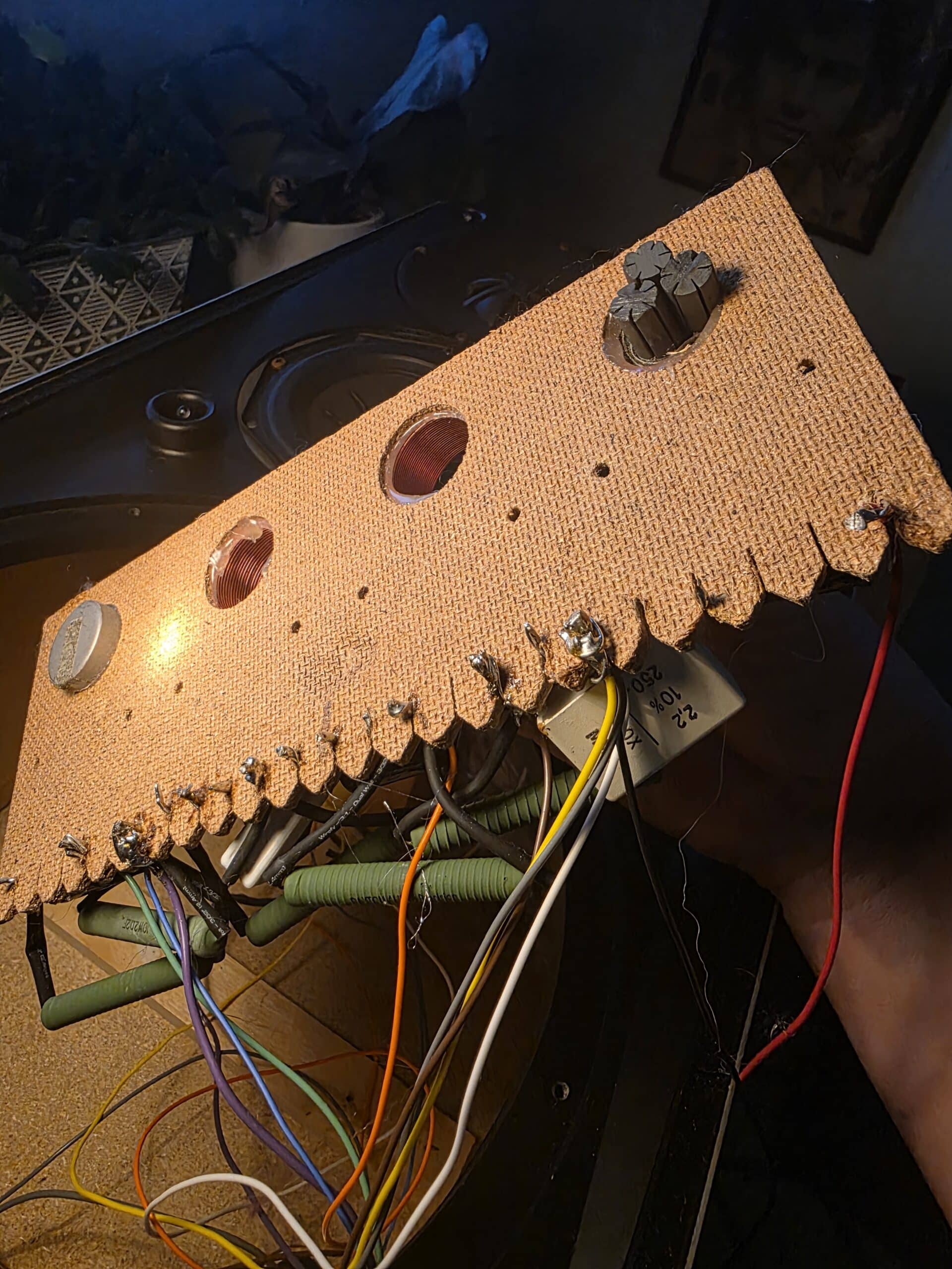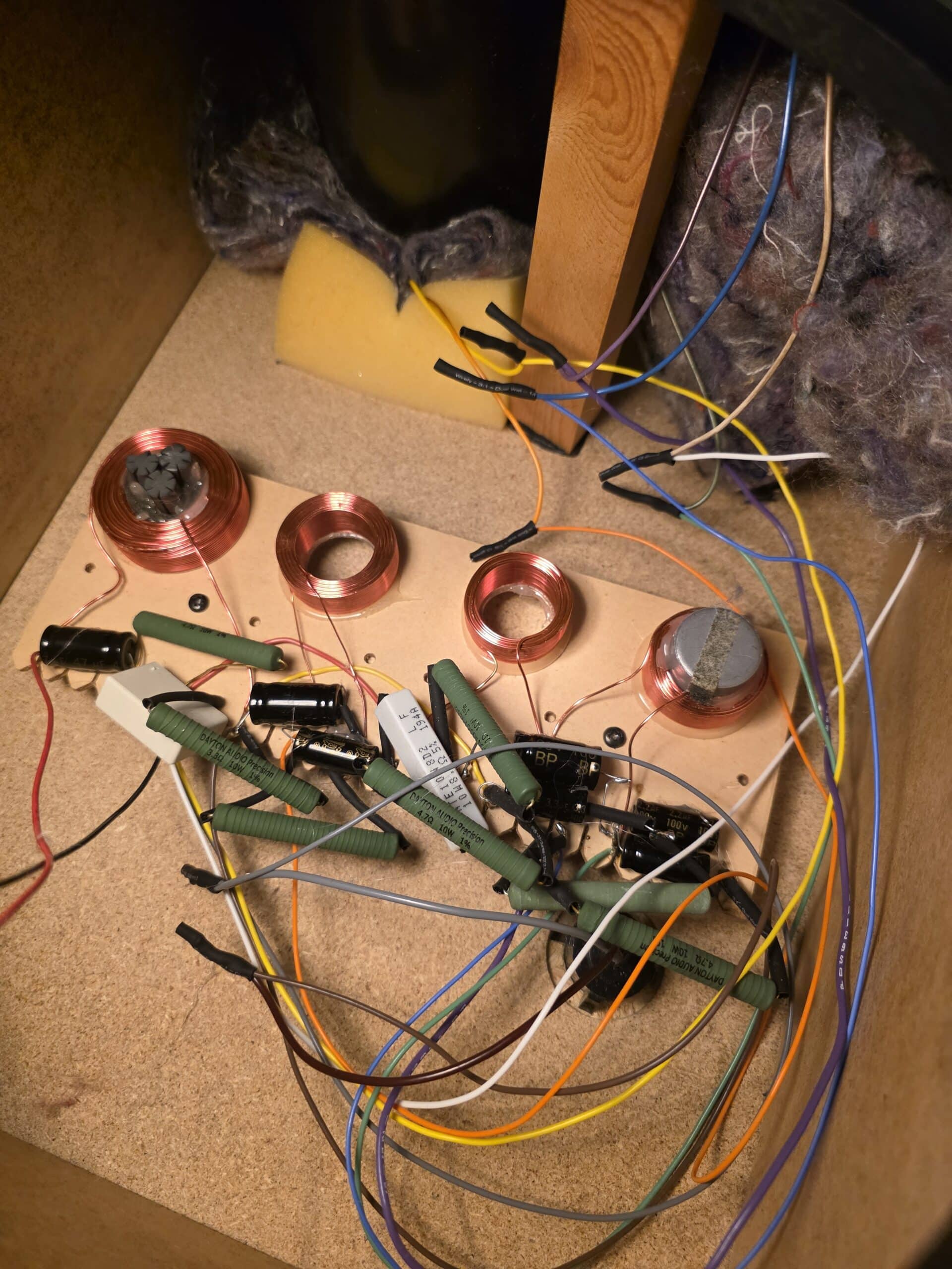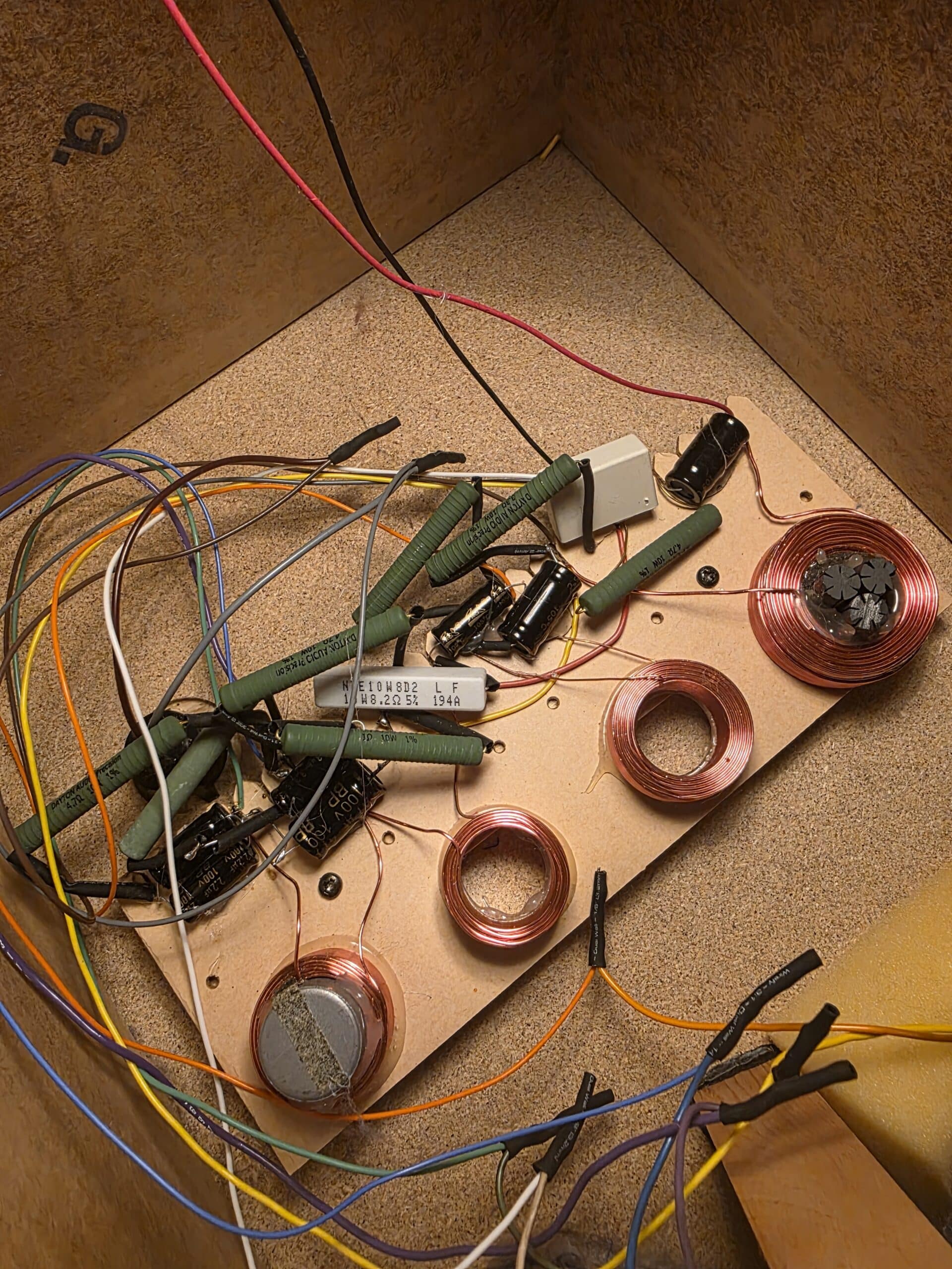 Then I looked at the crossover itself and was further surprised. The caps on the board all look like the caps I had sitting in a bag next to me, not what I have seen in my research. Then I realized that all of the wires to the speakers were spliced like the woofer speakers.